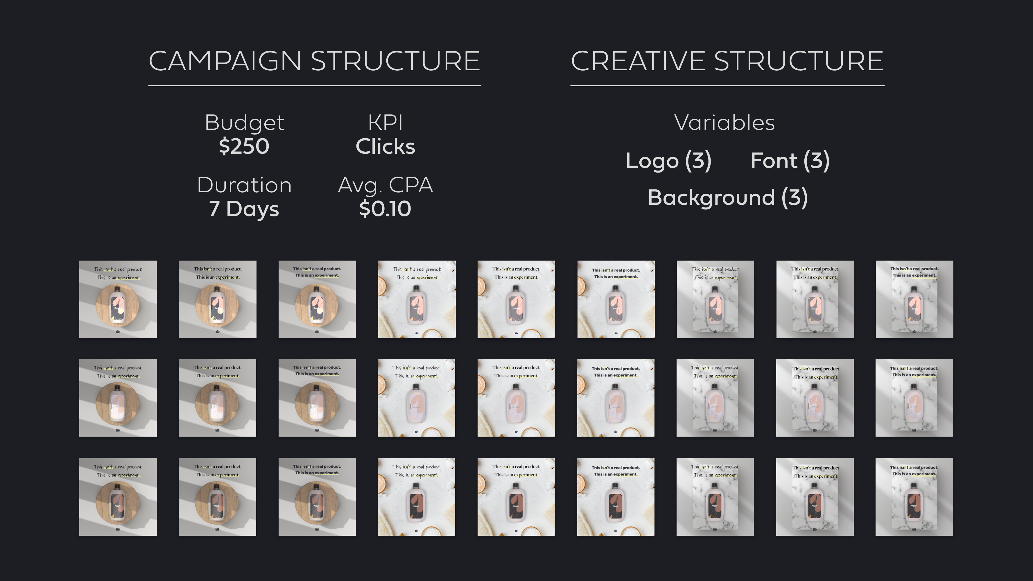 Companies advertising products with a high CPA have two options for their experiments: spend more or run less creative variants per test. In this example, we have a preset budget of $2,000 and know our CPA, KPI, and duration. With a $70 CPA we should be spending at least $56 per ad ($70 CPA * 80%). From there, we know that we should run about 36 ads ($2,000 budget / $56 per ad) - so we outlined 3 text, 4 graphic, and 3 design variants.