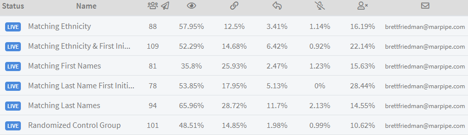 Friedmans also clicked links more, replied more, and signed up for Marpipe more! In fact, the only leads we got from this campaign were all Friedmans! Unsurprisingly, matching ethnicity had second most opens, but much fewer link clicks and replies than other categories.