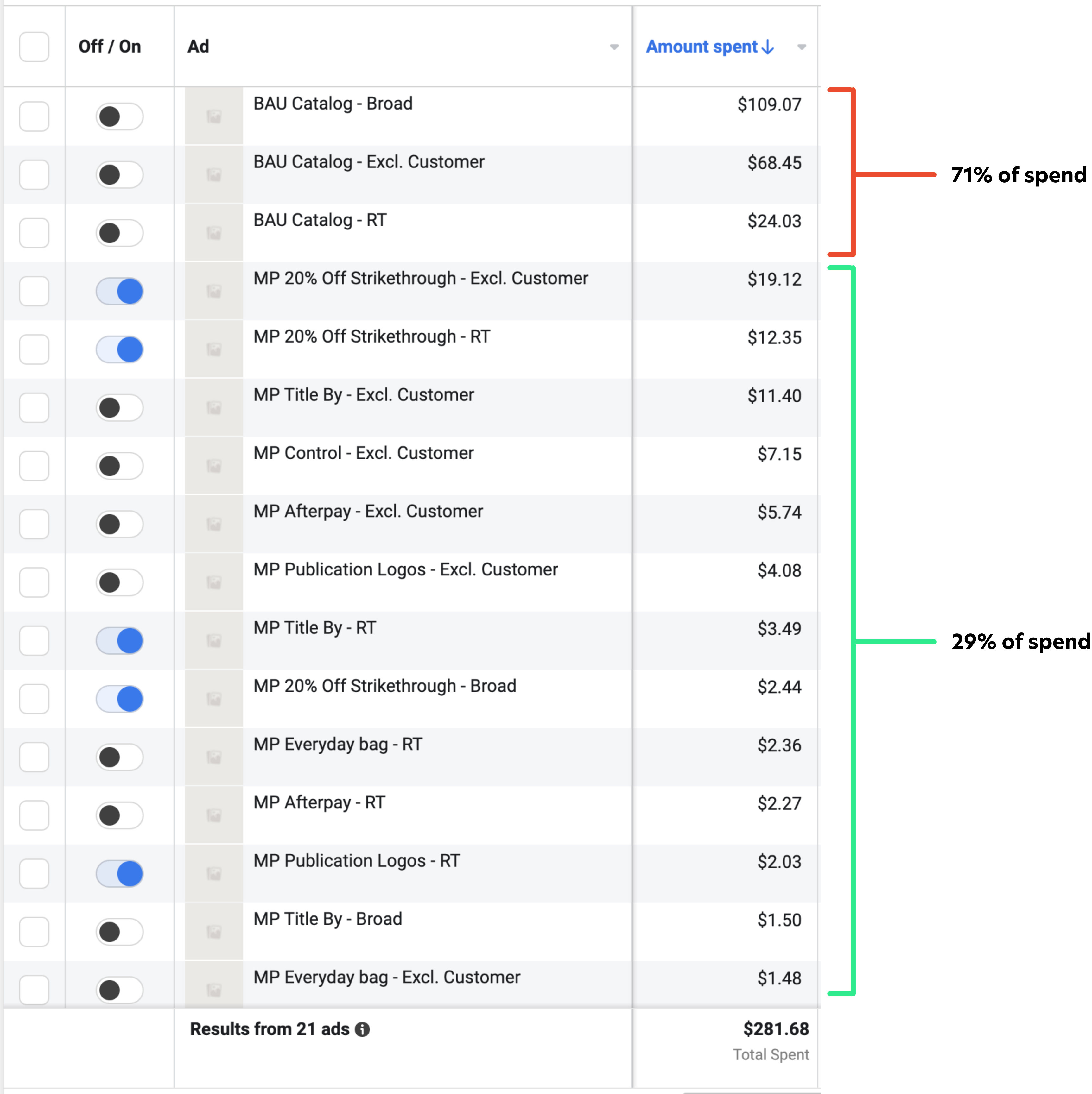 After the first couple days of the test, our suspicions that the BAU catalog would destroy the test were entirely validated. Almost no spend was given to any ads other than the BAU in all 3 ad sets in campaign 1. Even the control catalog which is visually identical to the BAU catalog was given no love by the algorithm. This essentially makes testing new catalogs impossible.